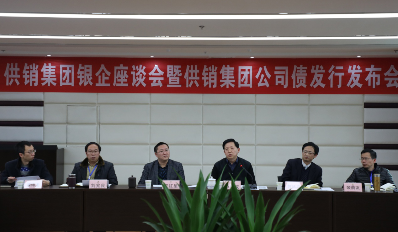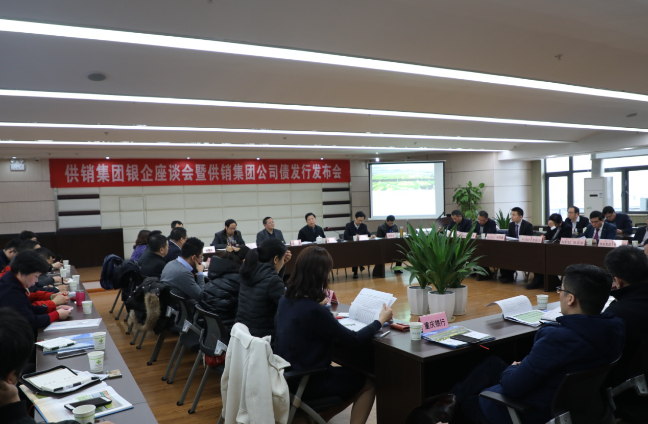 1月25日下午,供销集团在集团大会议室举办了“供销集团银企座谈会暨供销集团公司债发行发布会”。会议由供销集团副总经理苏廷均主持,供销集团总经理万仲成等班子成员以及各子集团相关领导出席会议。应邀出席本次会议的有工商银行、建设银行、农业银行、农发行、交通银行、中信银行、平安银行、光大银行、浙商银行、重庆银行、华夏银行、兴业银行、渤海银行、哈尔滨银行、国泰君安证券共15家金融机构。